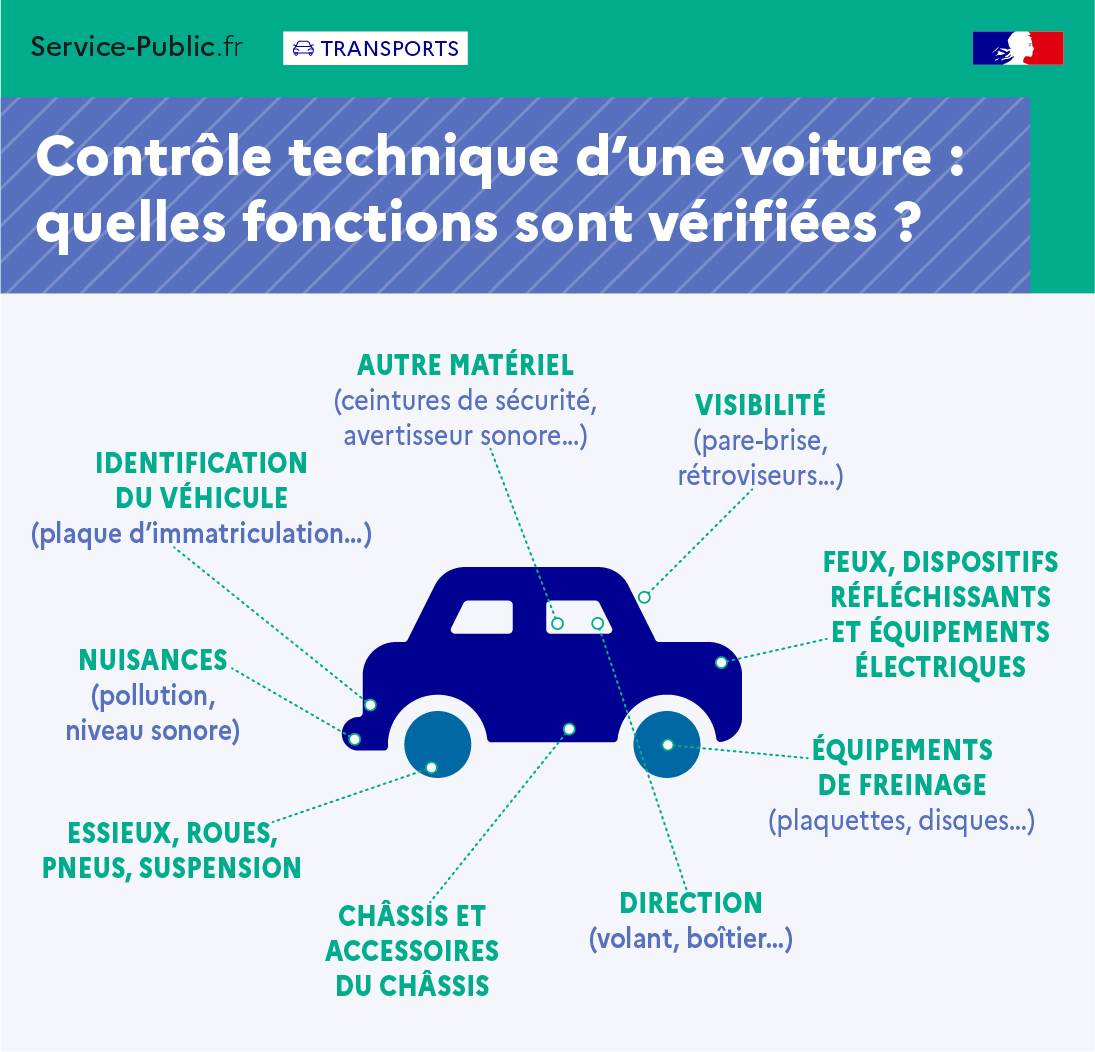 Les fonctions vérifiées lors du contrôle technique d’une voiture sont les suivantes :